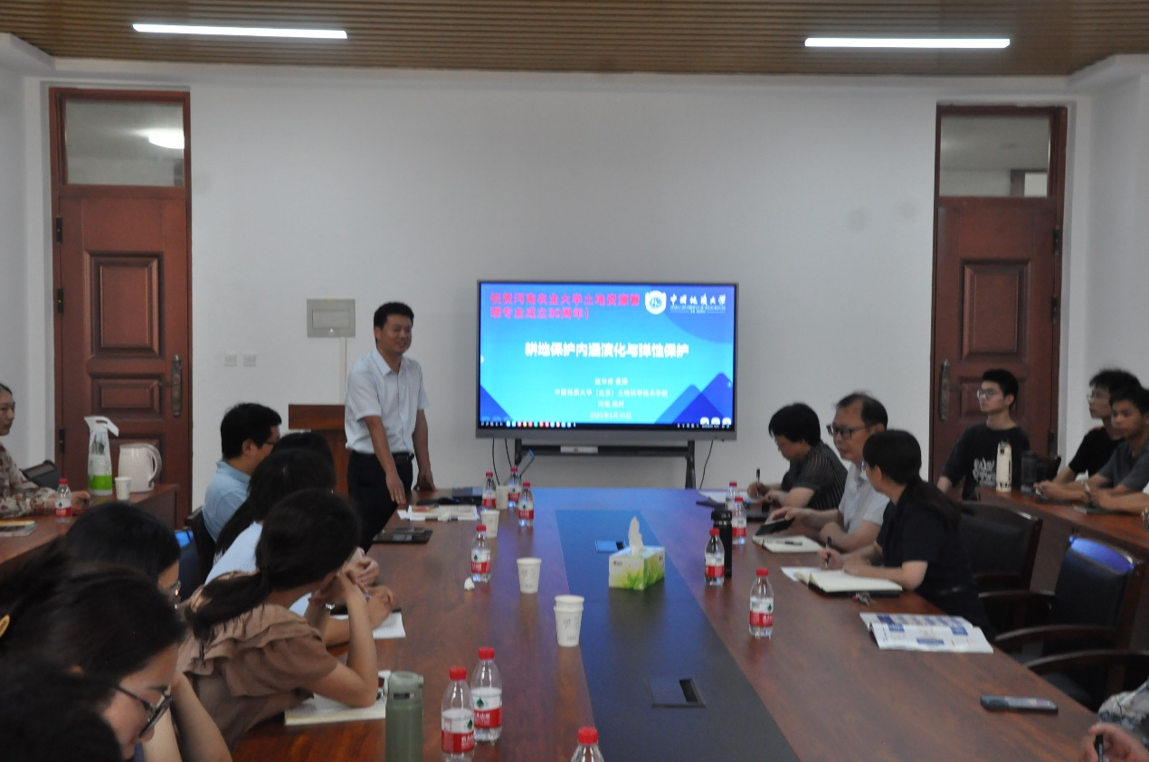 2023年6月30日,中国地质大学(北京)土地科学与技术学院赵华甫教授、土地资源管理系主任冯喆副教授、土地整治工程系主任张琢副教授、土地整治工程系青年骨干教师张建军副教授一行4人来欢乐斗地主下载 座谈,土地资源管理学科师生参加交流。